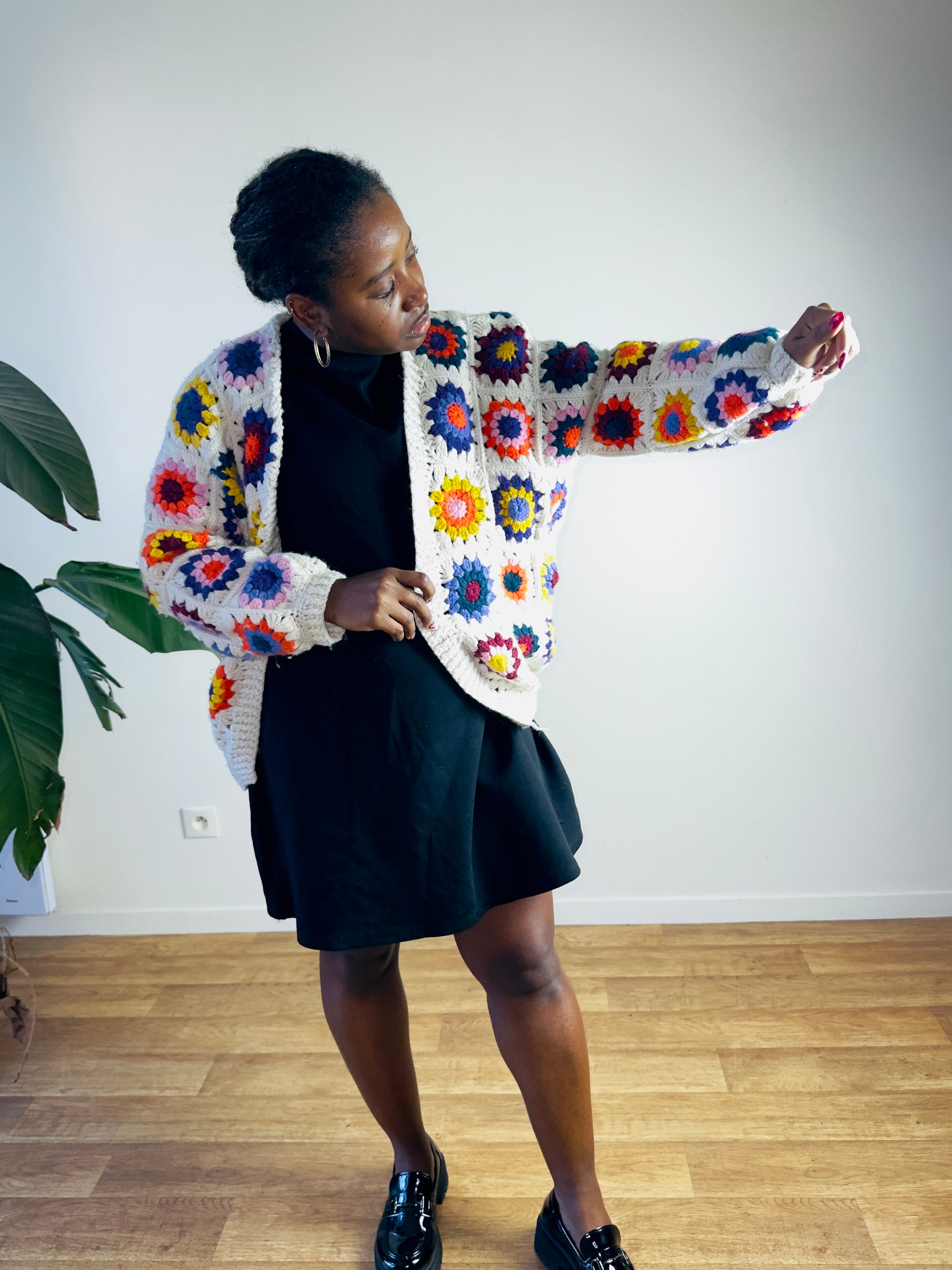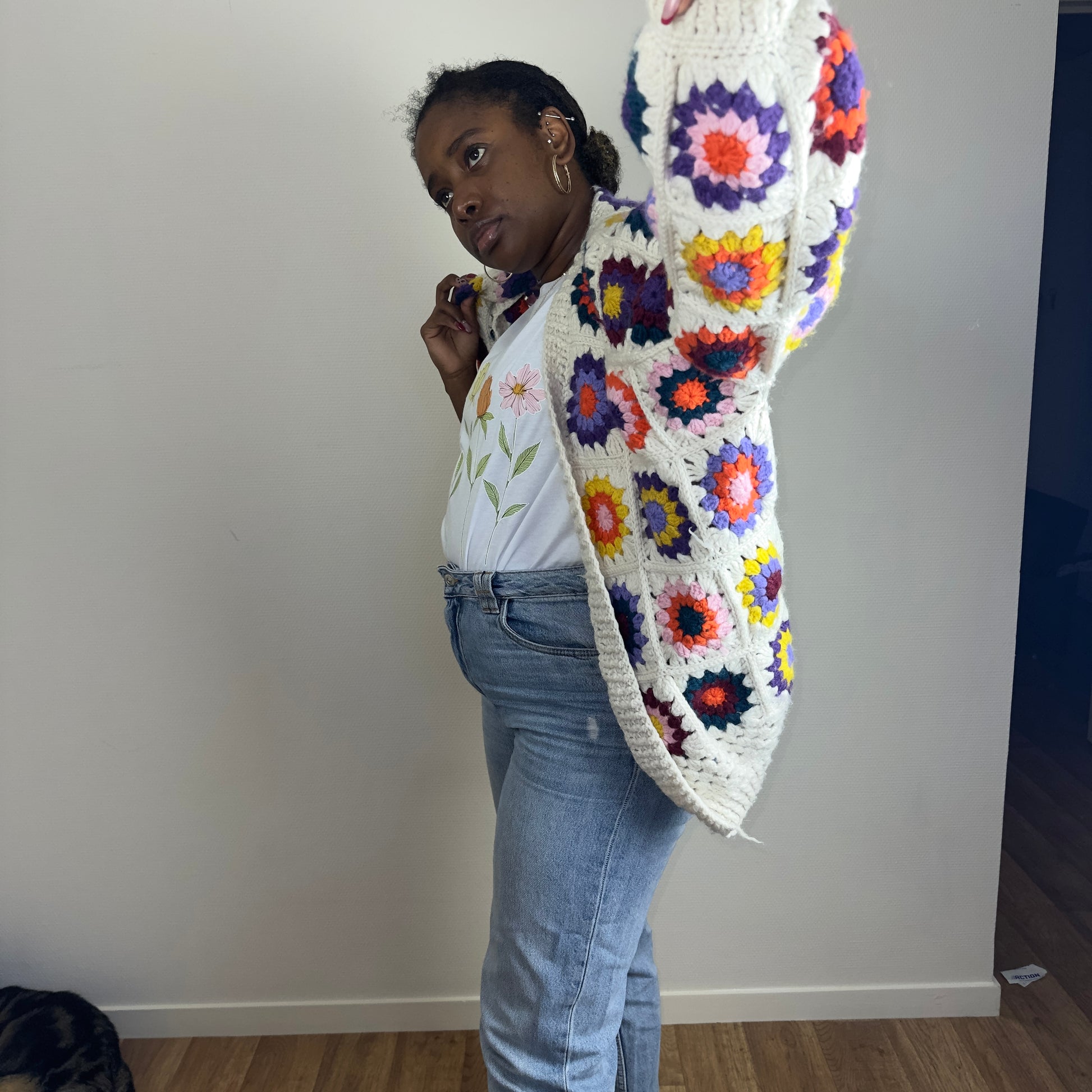 La veste Aurora incarne l’élégance artisanale. Chaque motif floral coloré est crocheté et assemblé à la main, donnant naissance à une création unique qui traverse les saisons avec raffinement.